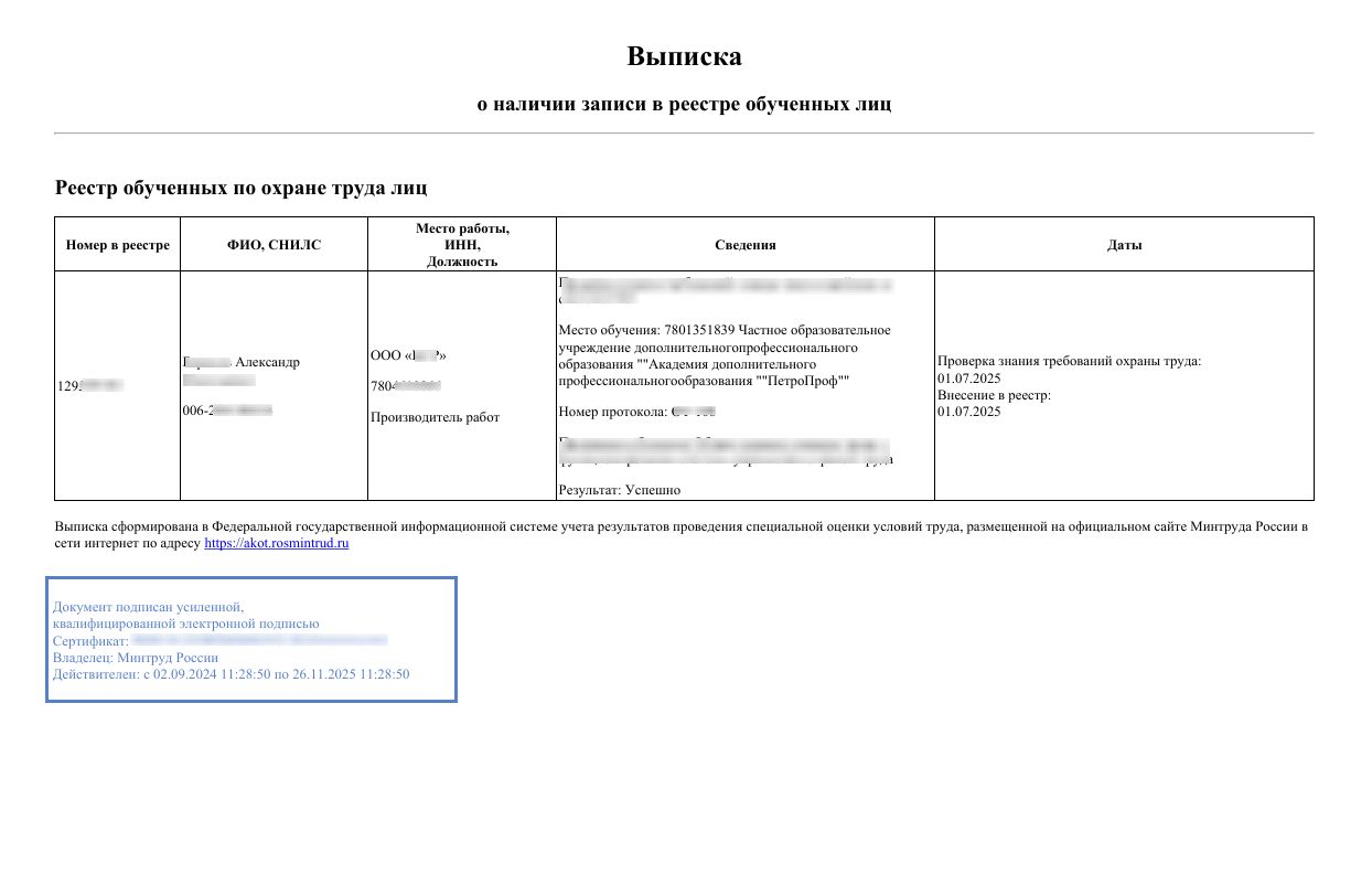 Выпускники курса обладают знаниями, необходимыми для организации безопасных условий труда, проведения инструктажей для персонала и взаимодействия с контролирующими органами.